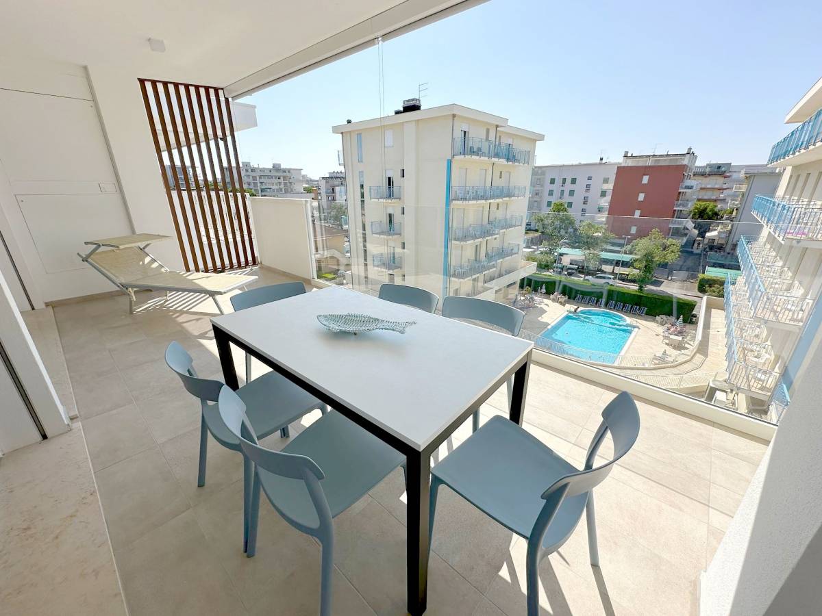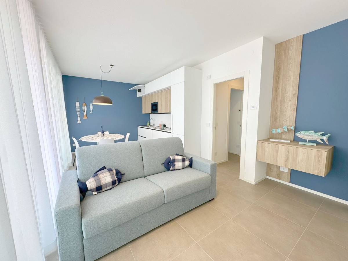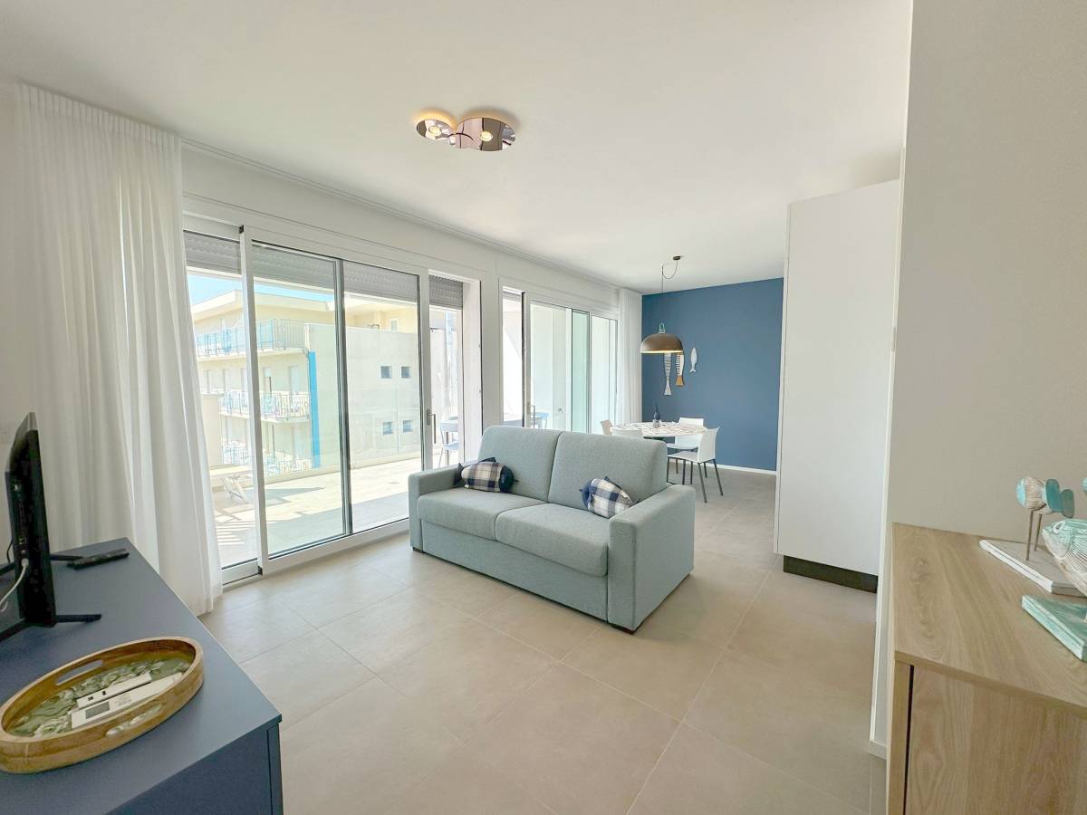 Residence con piscina di nuovissima costruzione situato nella zona di Piazza Aurora a 300 metri dal mare. Appartamento al quarto piano con ascensore, composto da soggiorno con angolo cottura a induzione e divano letto per una persona, terrazzo attrezzato, camera matrimoniale, cameretta con letto a castello, bagno con box doccia, n.1 posto auto (no van). Dotato di tv, clima, lavatrice, lavastoviglie e microonde. Totale posti letto: 4+2. Posto spiaggia escluso, è possibile prenotare il posto spiaggia presso il consorzio di zona. Non sono ammessi animali.