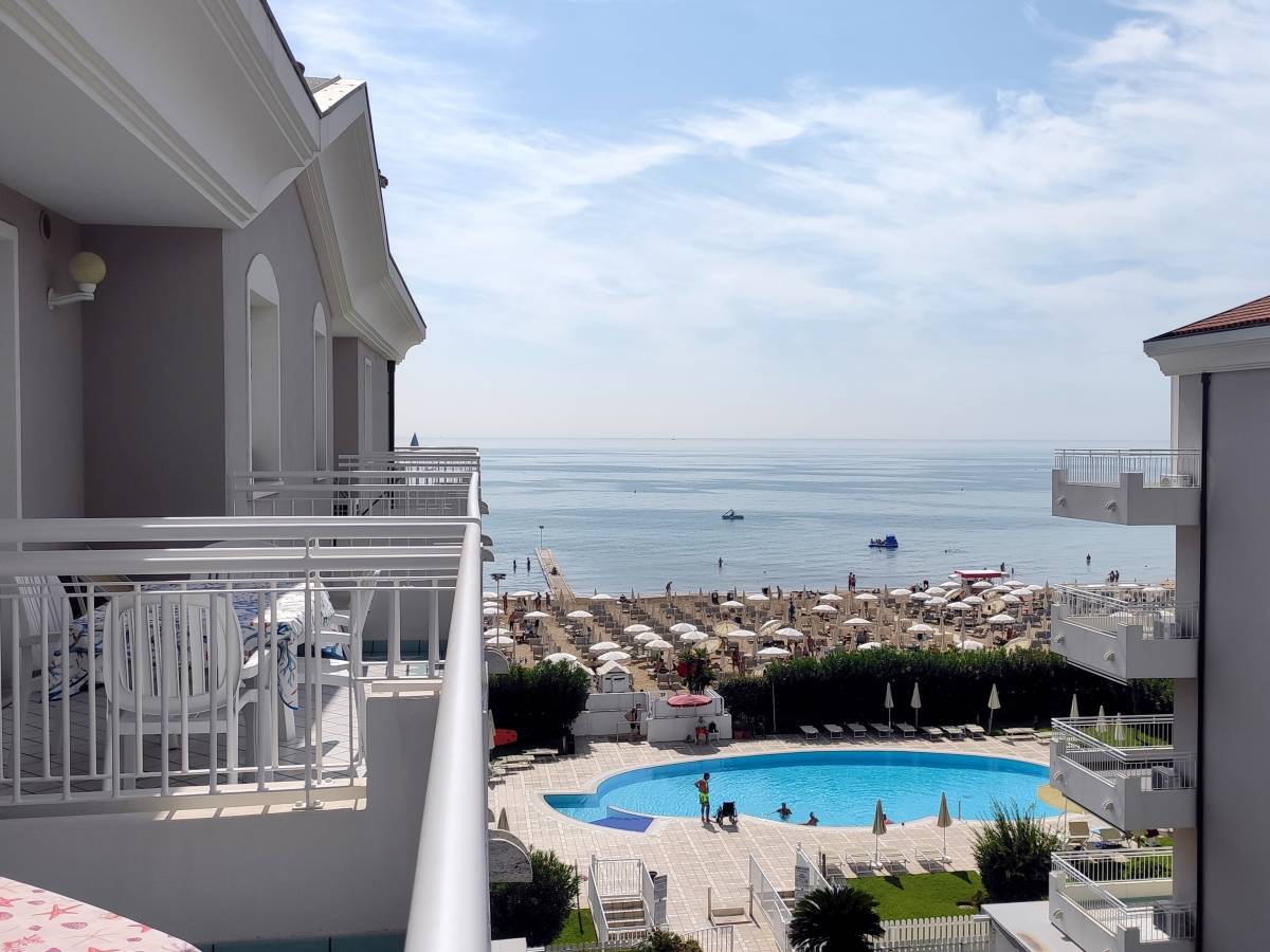 Residence Villa Elsa di recente ristrutturazione fronte mare in Piazza Mazzini con 2 piscine (una per adulti ed una per bimbi). Appartamento al 4° piano servito da ascensore. Composto da soggiorno/pranzo con angolo cottura e divano letto per una persona, n.1 camera matrimoniale, n.1 camera con due letti, bagno finestrato con box doccia e due ampi terrazzi laterali attrezzati con vista mare panoramica verso ovest. L'appartamento è dotato di TV, lavatrice, lavastoviglie, microonde, cassaforte, aria condizionata e porta blindata. N.1 posto auto nel seminterrato (no van) e di n.1 posto spiaggia incluso (due lettini ed un ombrellone per appartamento) presso il Consorzio Mazzini. Totale posti letto: 4+1. Non è prenotabile a gruppi di ragazzi.